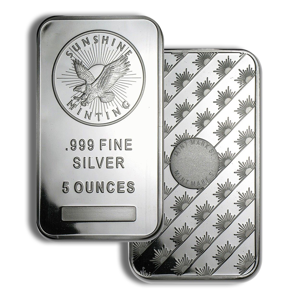 The Sunshine Minting silver bar is easily recognizable due to its meticulous design, featuring the mint's emblem - a radiant sun motif that symbolizes growth and excellence. Each bar is minted with unparalleled precision, highlighting both its aesthetic appeal and its inherent investment value. With its robust purity and substantial weight of five troy ounces, this bar serves as a cornerstone for any collection.